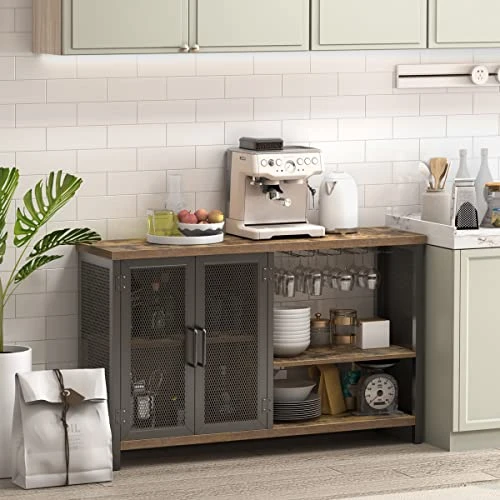 - Ample Storage Space—This coffee bar table has a large cabinet with mesh open doors, 2-tier open compartments and a spacious table top which provide plenty of storage space to meet your storage needs.