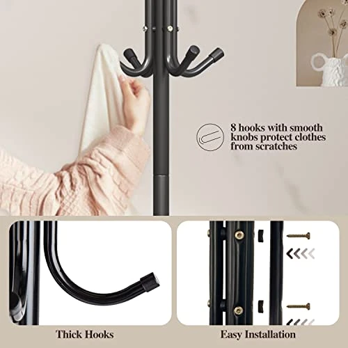 - 【Fit Size】The total height of the coat tree is 68in, with two rows of a total of 8 hooks, enough for you to store conveniently when you enter the door, so it’s a good choice to hang your clothes and bags on it.