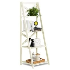 - REQUIRE ASSEMBLY: The wood ladder shelf is very easy to assemble. All the parts are labeled to make assembling easier. It has four spacious shelves. The cross part in the back has directions – make sure to put them in the right direction.